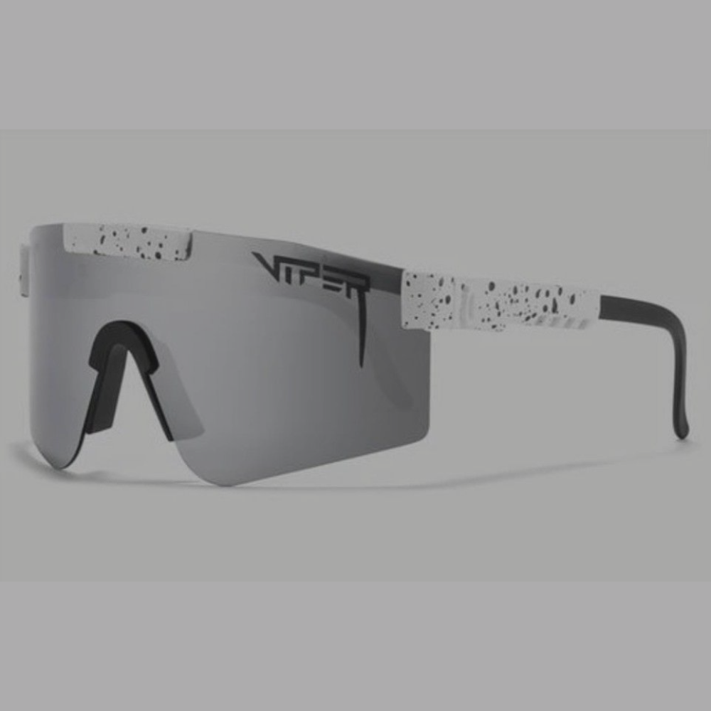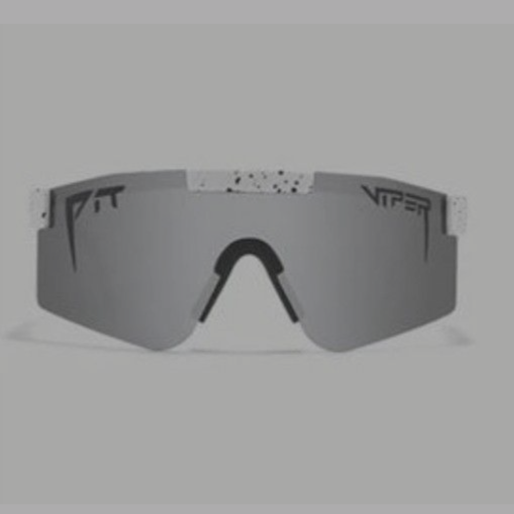 Icy silver-grey lenses with bold black temples and speckled accents, delivering sharp looks and peak sun protection for those who live life on the edge.